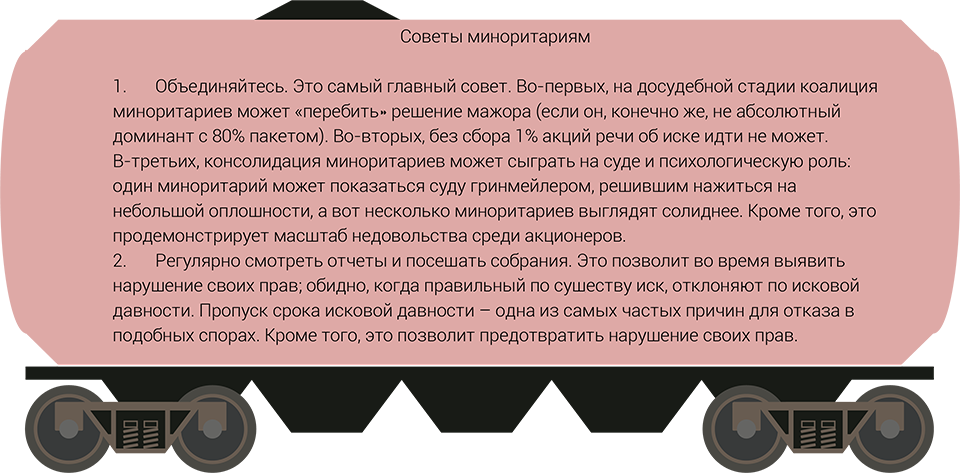 Да и вообще, акционерам необходимо быть активнее, настаивает Сергей Ермоленко из ФБК-Право: «Больше интересоваться и пользоваться своими правами, внимательнее следить за жизнью компании и поведением других акционеров». Только благодаря систематическому отслеживанию жизни общества акционер сможет при голосовании на общем собрании принять решение, действительно соответствующее его интересам, утверждает Яна Салата. Кроме того, миноритарий сможет определить, необходимо ли объединяться в группу с другими владельцами небольших пакетов бумаг для защиты своих интересов, выдвижения вопросов повестки дня и выбора членов совета директоров, отмечает эксперт.