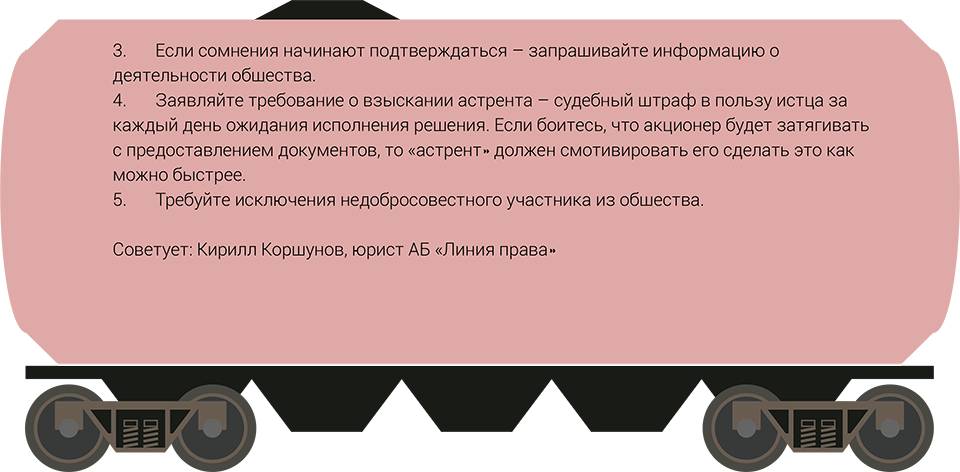 Акционеру, который хочет защитить свои права в подобных ситуациях, необходимо совершать сразу несколько действий, рассказывает адвокат S&K Вертикаль Иван Бабин. Во-первых, следить за актуальностью адреса, на который приходят уведомления о предстоящих собраниях акционеров. Во-вторых, знакомиться с материалами, которые предоставляются перед участием в собраниях. Особенно это касается документов, которые фигурируют на годовых собраниях, говорит Бабин. Законодательство и судебная практика, рассчитывая срок исковой давности, исходит из того, что о большинстве значимых обстоятельствах участники обществ узнают именно на этом мероприятии, объясняет юрист.
